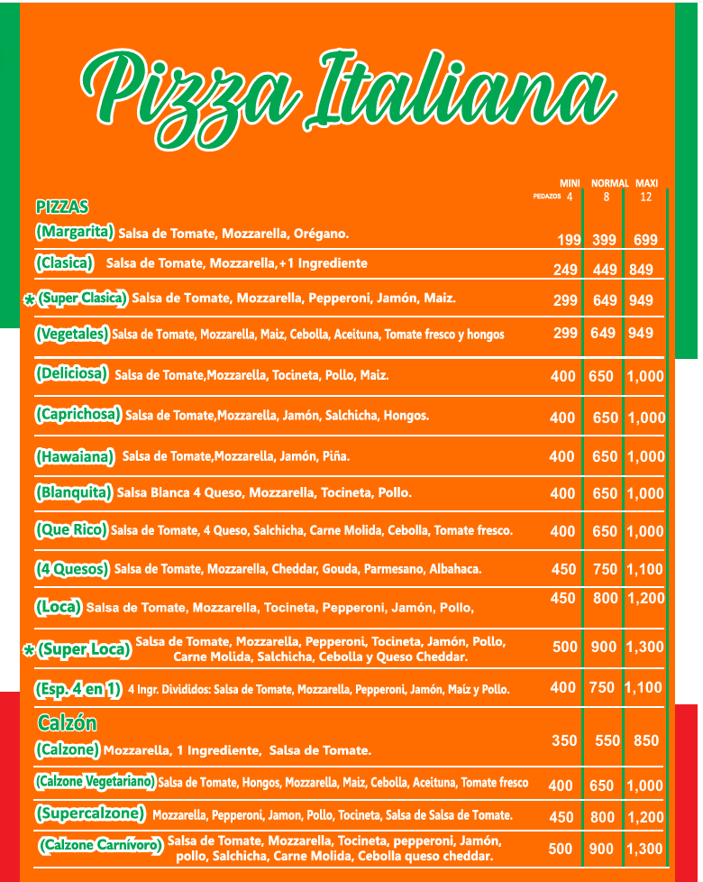 Salsa de Tomate, Mozzarella, Pepperoni, Tocineta, Jamon, Pollo, Carne Molida, Salchicha, Cebolla y Queso Cheddar.